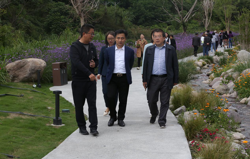 在大地公園景觀步道,大家一路前行,欣賞盛開的百花,感受和煦的春風,與公園美景合影留念。李總向客人們詳細介紹了項目景觀的設計理念,花卉苗木的種類和特點等情況。